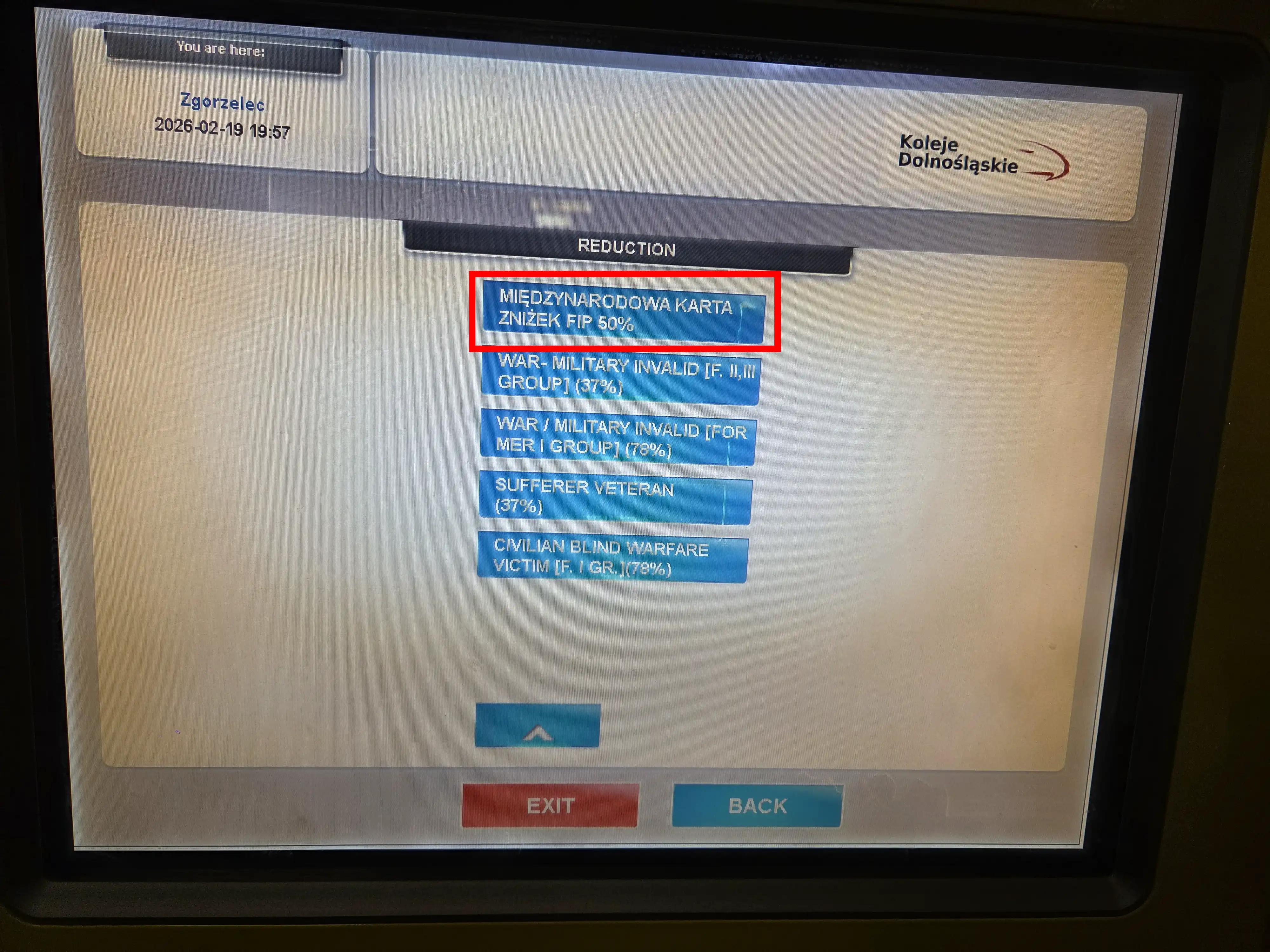 Discounted FIP 50 Tickets can be purchased at the ticket machines. Under “Weitere Rabatte” (further discounts), the discount “Międzynarodowej Karty Zniżek FIP 50%” must be selected. All discount options are spread across multiple pages. Afterwards, the option to add passengers with the discount appears in the previous menu.